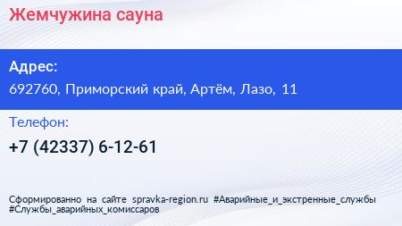 Жемчужина, сауна по адресу 692760, Приморский край, Артём, Лазо, 11 в дальнейшем Организация, размещена в следующих категориях: