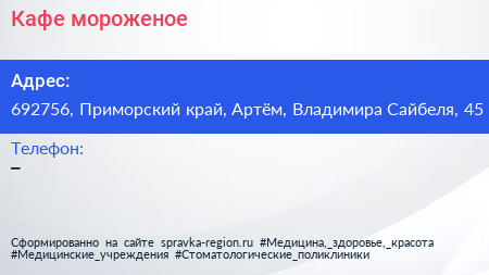 Кафе-мороженое по адресу 692756, Приморский край, Артём, Владимира Сайбеля, 45 в дальнейшем Организация, размещена в следующих категориях: