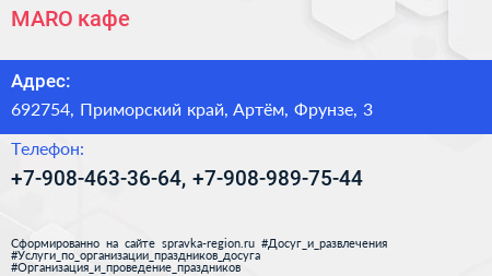MARO, кафе по адресу 692754, Приморский край, Артём, Фрунзе, 3 в дальнейшем Организация, размещена в следующих категориях: