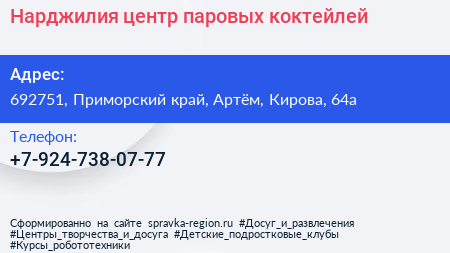 Нарджилия, центр паровых коктейлей по адресу 692751, Приморский край, Артём, Кирова, 64а в дальнейшем Организация, размещена в следующих категориях: