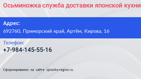 Осьминожка, служба доставки японской кухни по адресу 692760, Приморский край, Артём, Кирова, 16 в дальнейшем Организация, размещена в следующих категориях: