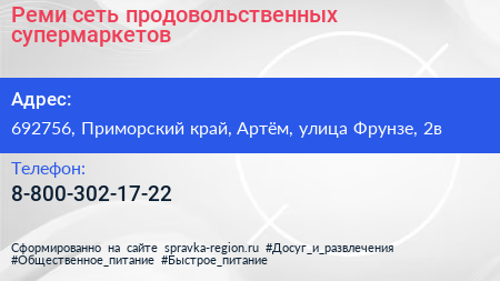 Реми, сеть продовольственных супермаркетов по адресу 692756, Приморский край, Артём, улица Фрунзе, 2в в дальнейшем Организация, размещена в следующих категориях: