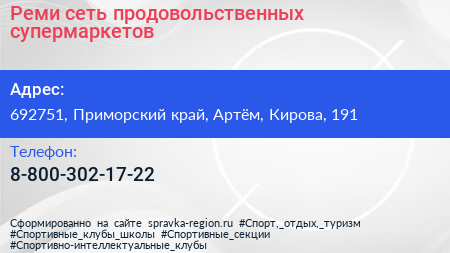 Реми, сеть продовольственных супермаркетов по адресу 692751, Приморский край, Артём, Кирова, 191 в дальнейшем Организация, размещена в следующих категориях: