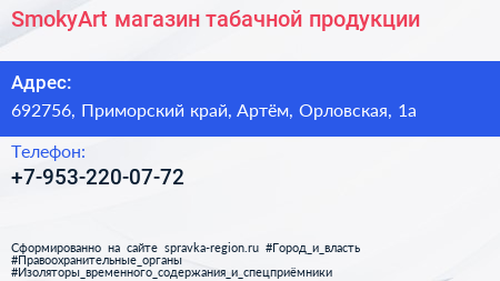 SmokyArt, магазин табачной продукции по адресу 692756, Приморский край, Артём, Орловская, 1а в дальнейшем Организация, размещена в следующих категориях: