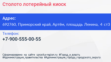 Столото, лотерейный киоск по адресу 692760, Приморский край, Артём, площадь Ленина, 4 ст3 в дальнейшем Организация, размещена в следующих категориях: