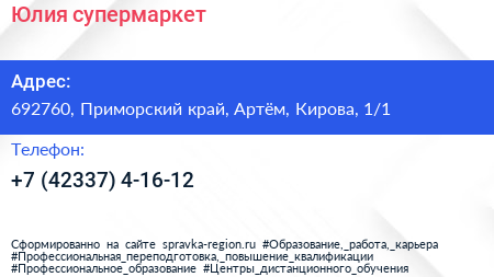 Юлия, супермаркет по адресу 692760, Приморский край, Артём, Кирова, 1/1 в дальнейшем Организация, размещена в следующих категориях: