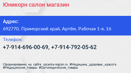 Юникорн, салон-магазин по адресу 692770, Приморский край, Артём, Рабочая 1-я, 16 в дальнейшем Организация, размещена в следующих категориях: