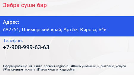 Зебра, суши-бар по адресу 692751, Приморский край, Артём, Кирова, 64в в дальнейшем Организация, размещена в следующих категориях: