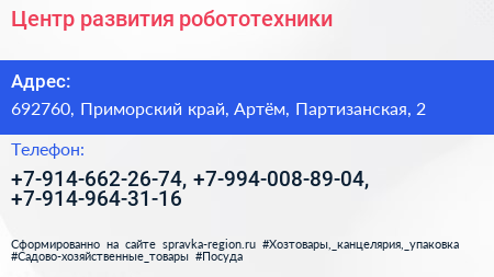 Центр развития робототехники по адресу 692760, Приморский край, Артём, Партизанская, 2 в дальнейшем Организация, размещена в следующих категориях: