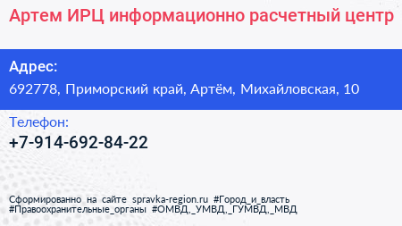 Артем ИРЦ, информационно-расчетный центр по адресу 692778, Приморский край, Артём, Михайловская, 10 в дальнейшем Организация, размещена в следующих категориях: