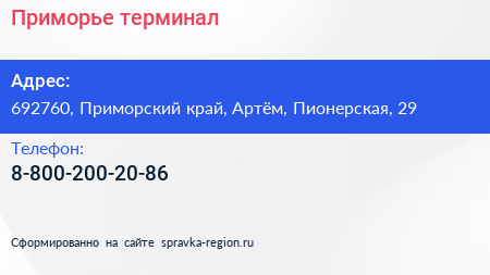 Приморье, терминал по адресу 692760, Приморский край, Артём, Пионерская, 29 в дальнейшем Организация, размещена в следующих категориях: