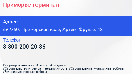 Приморье, терминал по адресу 692760, Приморский край, Артём, Фрунзе, 48 в дальнейшем Организация, размещена в следующих категориях: