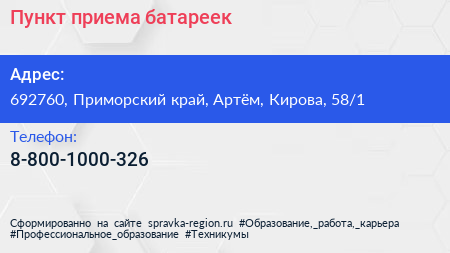 Пункт приема батареек по адресу 692760, Приморский край, Артём, Кирова, 58/1 в дальнейшем Организация, размещена в следующих категориях: