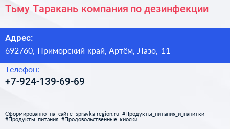 Тьму-Таракань, компания по дезинфекции по адресу 692760, Приморский край, Артём, Лазо, 11 в дальнейшем Организация, размещена в следующих категориях:
