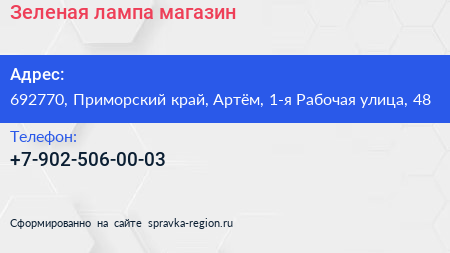 Зеленая лампа, магазин по адресу 692770, Приморский край, Артём, 1-я Рабочая улица, 48 в дальнейшем Организация, размещена в следующих категориях: