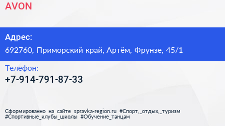 AVON по адресу 692760, Приморский край, Артём, Фрунзе, 45/1 в дальнейшем Организация, размещена в следующих категориях: