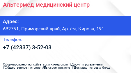 Альтермед, медицинский центр по адресу 692751, Приморский край, Артём, Кирова, 191 в дальнейшем Организация, размещена в следующих категориях:
