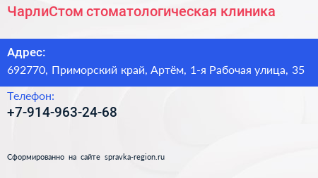 ЧарлиСтом, стоматологическая клиника по адресу 692770, Приморский край, Артём, 1-я Рабочая улица, 35 в дальнейшем Организация, размещена в следующих категориях: