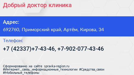 Добрый доктор, клиника по адресу 692760, Приморский край, Артём, Кирова, 34 в дальнейшем Организация, размещена в следующих категориях: