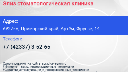 Элиз, стоматологическая клиника по адресу 692756, Приморский край, Артём, Фрунзе, 14 в дальнейшем Организация, размещена в следующих категориях: