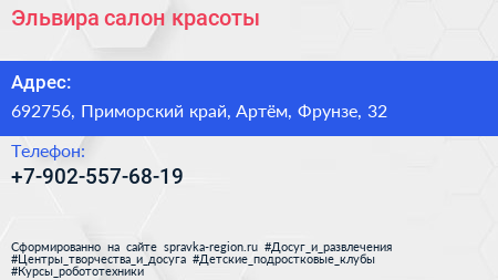 Эльвира, салон красоты по адресу 692756, Приморский край, Артём, Фрунзе, 32 в дальнейшем Организация, размещена в следующих категориях: