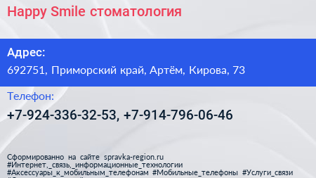 Happy Smile, стоматология по адресу 692751, Приморский край, Артём, Кирова, 73 в дальнейшем Организация, размещена в следующих категориях: