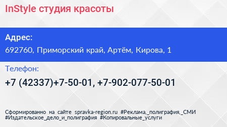 InStyle, студия красоты по адресу 692760, Приморский край, Артём, Кирова, 1 в дальнейшем Организация, размещена в следующих категориях:
