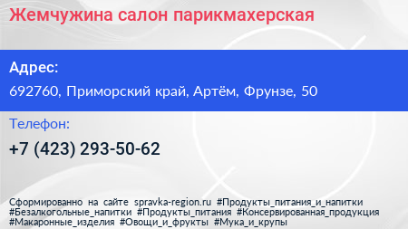 Жемчужина, салон-парикмахерская по адресу 692760, Приморский край, Артём, Фрунзе, 50 в дальнейшем Организация, размещена в следующих категориях: