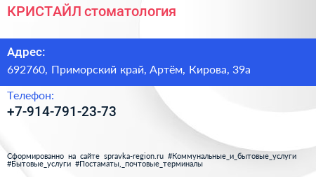 КРИСТАЙЛ, стоматология по адресу 692760, Приморский край, Артём, Кирова, 39а в дальнейшем Организация, размещена в следующих категориях: