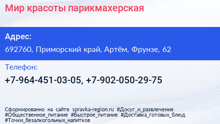 Мир красоты, парикмахерская по адресу 692760, Приморский край, Артём, Фрунзе, 62 в дальнейшем Организация, размещена в следующих категориях: