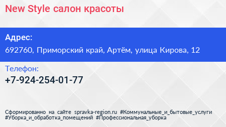 New Style, салон красоты по адресу 692760, Приморский край, Артём, улица Кирова, 12 в дальнейшем Организация, размещена в следующих категориях: