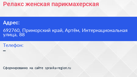 Релакс, женская парикмахерская по адресу 692760, Приморский край, Артём, Интернациональная улица, 88 в дальнейшем Организация, размещена в следующих категориях: