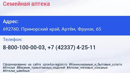 Семейная аптека по адресу 692760, Приморский край, Артём, Фрунзе, 65 в дальнейшем Организация, размещена в следующих категориях: