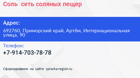 Соль+, сеть соляных пещер по адресу 692760, Приморский край, Артём, Интернациональная улица, 90 в дальнейшем Организация, размещена в следующих категориях: