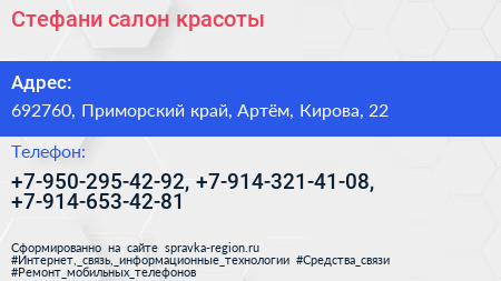 Стефани, салон красоты по адресу 692760, Приморский край, Артём, Кирова, 22 в дальнейшем Организация, размещена в следующих категориях: