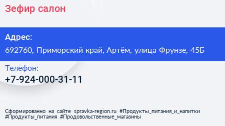 Зефир, салон по адресу 692760, Приморский край, Артём, улица Фрунзе, 45Б в дальнейшем Организация, размещена в следующих категориях:
