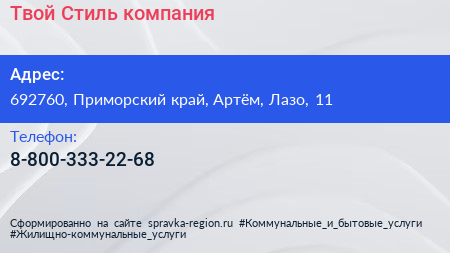 Твой Стиль, компания по адресу 692760, Приморский край, Артём, Лазо, 11 в дальнейшем Организация, размещена в следующих категориях: