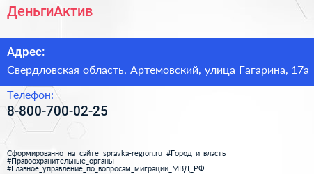 ДеньгиАктив по адресу Свердловская область, Артемовский, улица Гагарина, 17а в дальнейшем Организация, размещена в следующих категориях: