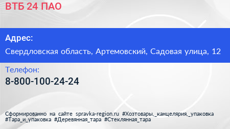 ВТБ 24, ПАО по адресу Свердловская область, Артемовский, Садовая улица, 12 в дальнейшем Организация, размещена в следующих категориях: