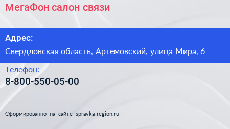 МегаФон, салон связи по адресу Свердловская область, Артемовский, улица Мира, 6 в дальнейшем Организация, размещена в следующих категориях: