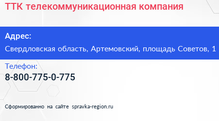 ТТК, телекоммуникационная компания по адресу Свердловская область, Артемовский, площадь Советов, 1 в дальнейшем Организация, размещена в следующих категориях: