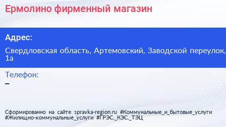Ермолино, фирменный магазин по адресу Свердловская область, Артемовский, Заводской переулок, 1а в дальнейшем Организация, размещена в следующих категориях: