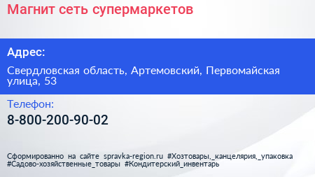 Магнит, сеть супермаркетов по адресу Свердловская область, Артемовский, Первомайская улица, 53 в дальнейшем Организация, размещена в следующих категориях: