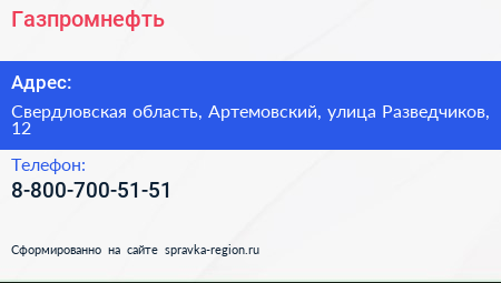 Газпромнефть по адресу Свердловская область, Артемовский, улица Разведчиков, 12 в дальнейшем Организация, размещена в следующих категориях: