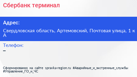 Сбербанк, терминал по адресу Свердловская область, Артемовский, Почтовая улица, 1 к А в дальнейшем Организация, размещена в следующих категориях: