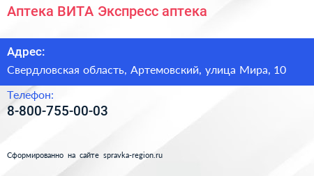 Аптека ВИТА Экспресс, аптека по адресу Свердловская область, Артемовский, улица Мира, 10 в дальнейшем Организация, размещена в следующих категориях: