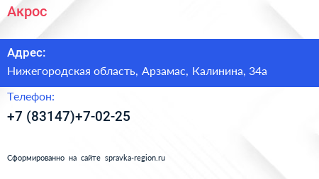 Акрос по адресу Нижегородская область, Арзамас, Калинина, 34а в дальнейшем Организация, размещена в следующих категориях: