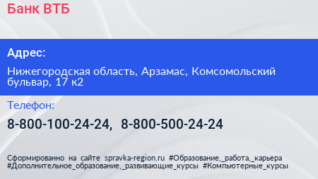 Банк ВТБ по адресу Нижегородская область, Арзамас, Комсомольский бульвар, 17 к2 в дальнейшем Организация, размещена в следующих категориях: