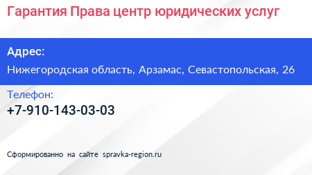 Гарантия Права, центр юридических услуг по адресу Нижегородская область, Арзамас, Севастопольская, 26 в дальнейшем Организация, размещена в следующих категориях: