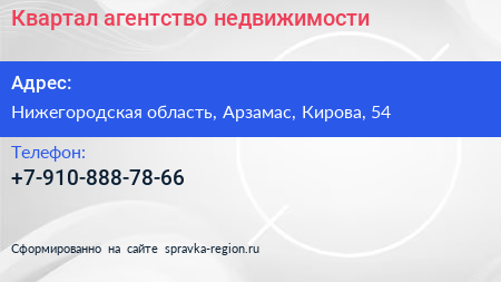 Квартал, агентство недвижимости по адресу Нижегородская область, Арзамас, Кирова, 54 в дальнейшем Организация, размещена в следующих категориях: